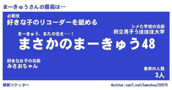 | 肩書あだ名 | 『まーきゅう店長』『まーきゅう国家主席』 |
