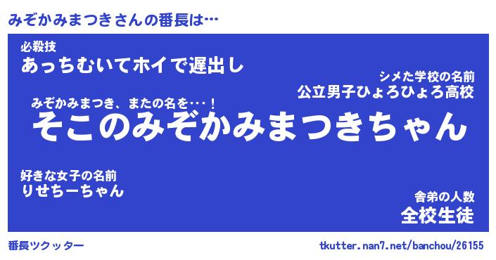 | 伝説のあだ名 | 『不死鳥のスナイパーみぞかみまつき』 |