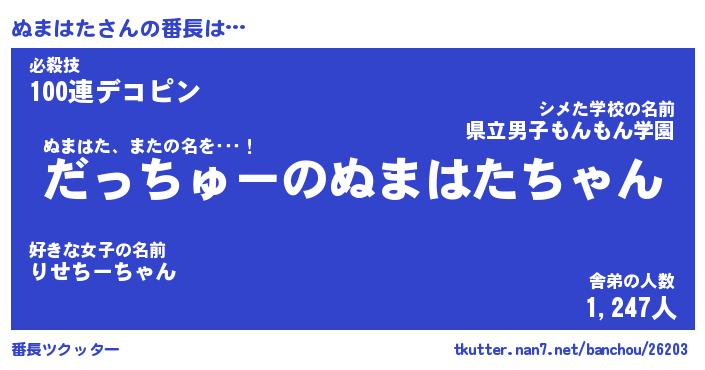 | 意味不明あだ名 | 『ペロリンぬまはた』『永久保存ぬまはた』 |