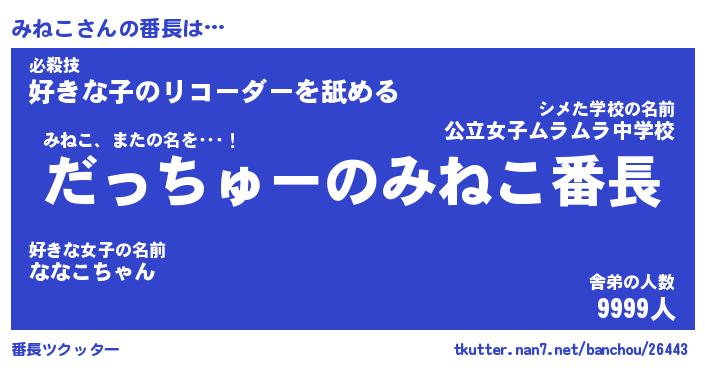 | 伝説のあだ名 | 『伝説のスナイパーみねこ』 |