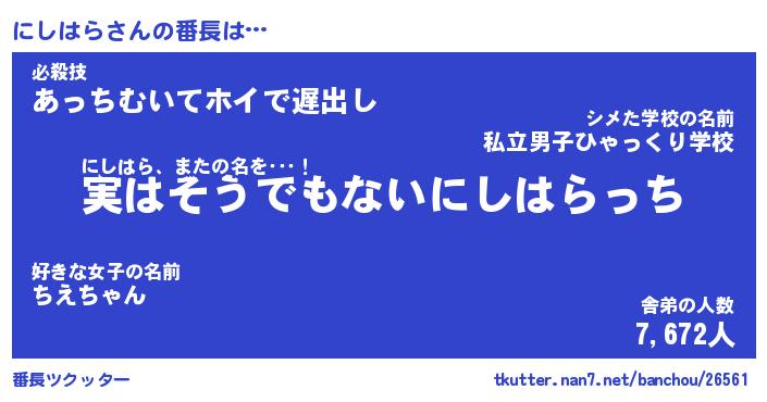 | ポケモン風あだ名 | 『ニシチュウ』『ニシハダネ』 |