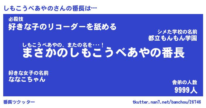 | 男性向けラノベタイトル風あだ名 | 『しもこうべあやのの憂鬱』 |