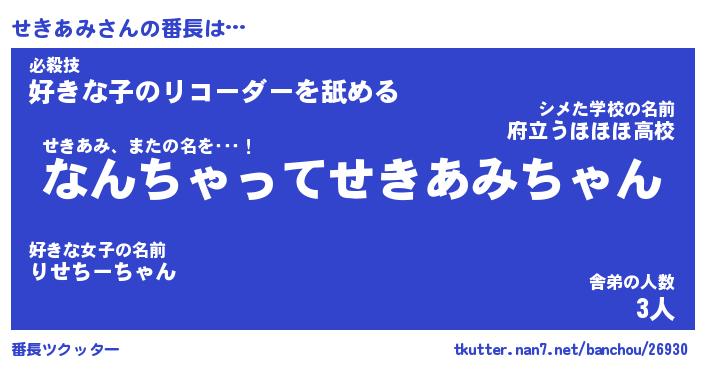| 意味不明あだ名 | 『ペロリンせきあみ』『永久保存せきあみ』 |