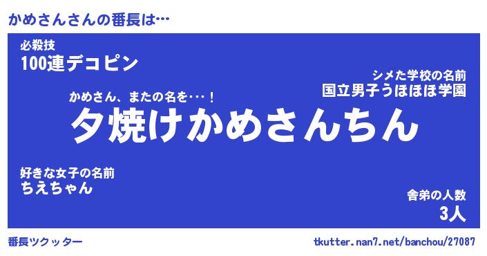 | 意味不明あだ名 | 『ペロリンかめさん』『永久保存かめさん』 |