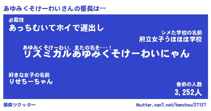 | 伝説のあだ名 | 『伝説のスナイパーあゆみくそけーわい』 |