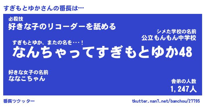 | 伝説のあだ名 | 『伝説のスナイパーすぎもとゆか』 |