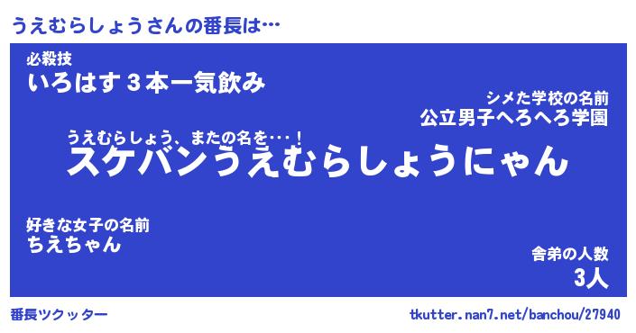 | 伝説のあだ名 | 『不死鳥のスナイパーうえむらしょう』 |