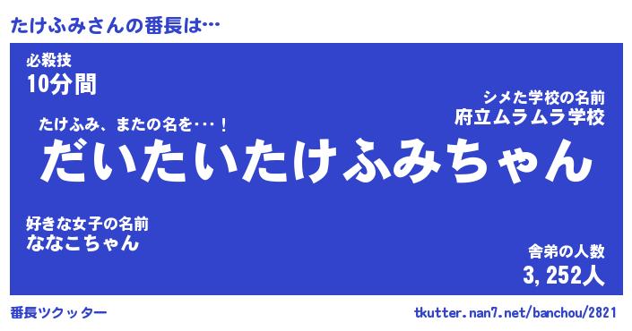 | 意味不明あだ名 | 『ペロリンたけふみ』『永久保存たけふみ』 |