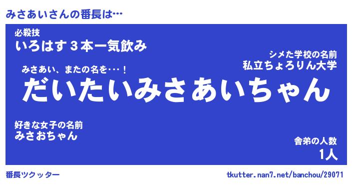 | 意味不明あだ名 | 『ペロリンみさあい』『永久保存みさあい』 |