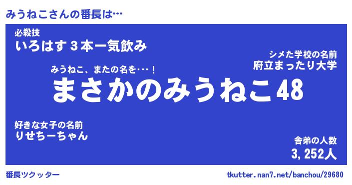 | 肩書あだ名 | 『みうねこ店長』『みうねこ大統領』 |