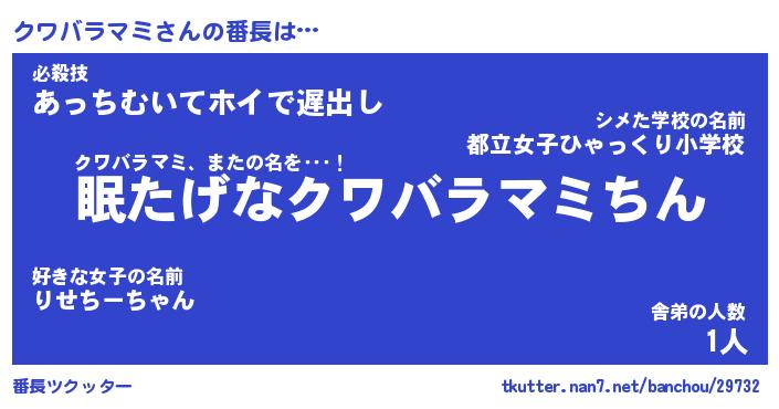 | ヒーロー風カッコイイあだ名 | 『スーパークワバラマミ』『黄金騎士クワ』 |