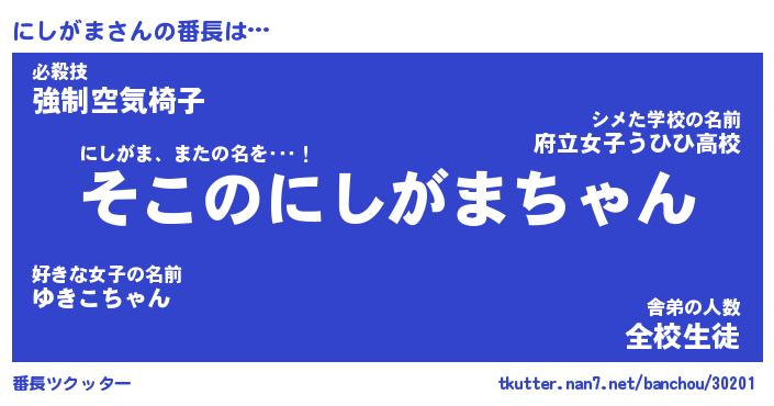 | ポケモン風あだ名 | 『ニシチュウ』『ニシガダネ』 |
