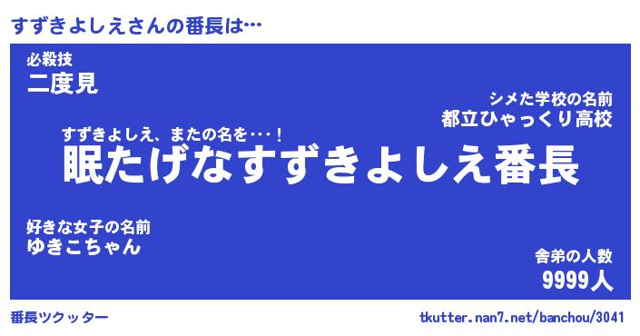| ヒーロー風カッコイイあだ名 | 『スーパースズキヨシエ』『天弓騎士スズ』 |