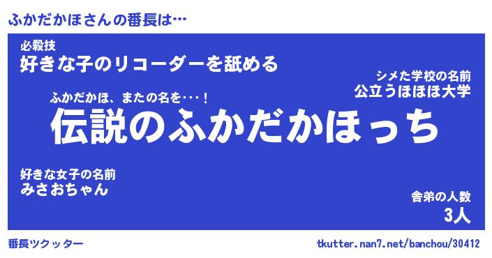 | ヘコむあだ名 | 『ふかにゅー』『つくし』『ふかっぺ』 |
