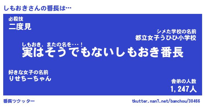 | 意味不明あだ名 | 『ペロリンしもおき』『永久保存しもおき』 |