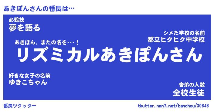 | 肩書あだ名 | 『あきぽん店長』『あきぽん国家主席』 |