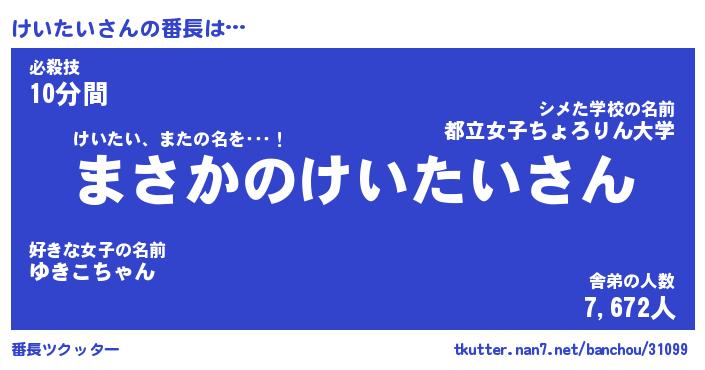 | 意味不明あだ名 | 『ペロリンけいたい』『永久保存けいたい』 |