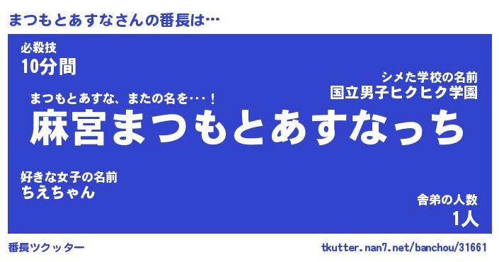 | 男性向けラノベタイトル風あだ名 | 『マツモトアスナアートオンライン』 |