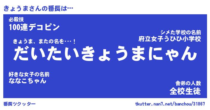 | ヒーロー風カッコイイあだ名 | 『スーパーキョウマ』『暗黒騎士キョ』 |
