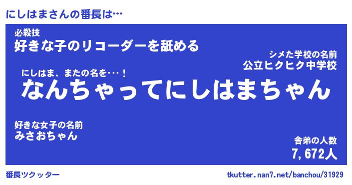 | 意味不明あだ名 | 『ペロリンにしはま』『永久保存にしはま』 |