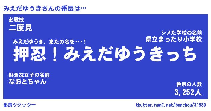 | ヒーロー風カッコイイあだ名 | 『スーパーミエダユウキ』『炎刃騎士ミエ』 |