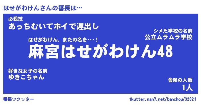 | 肩書あだ名 | 『はせがわけん店長』『はせがわけん塾長』 |