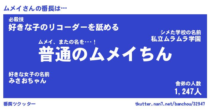 | ヘコむあだ名 | 『ムメにー』『なまこ酢』『ムメお』 |