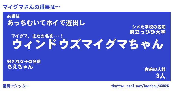 | 意味不明あだ名 | 『ペロリンマイグマ』『永久保存マイグマ』 |