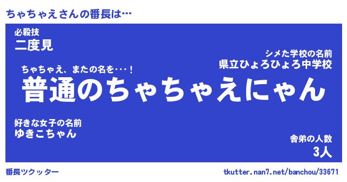 | 男性向けラノベタイトル風あだ名 | 『ちゃちゃえの憂鬱』 |