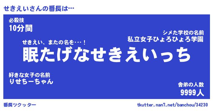 | 意味不明あだ名 | 『ペロリンせきえい』『永久保存せきえい』 |