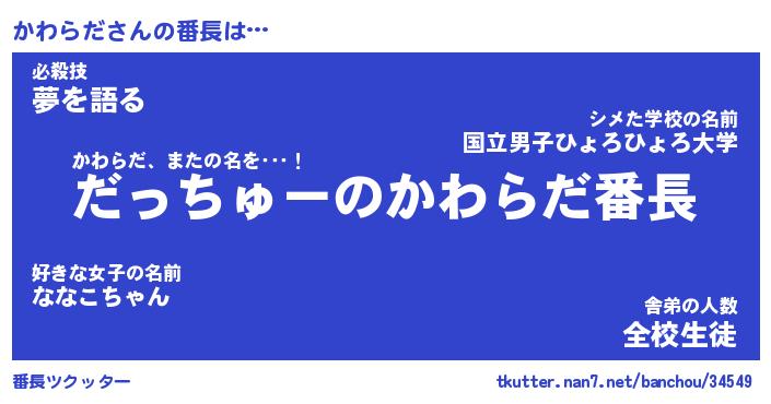 | 意味不明あだ名 | 『ペロリンかわらだ』『永久保存かわらだ』 |