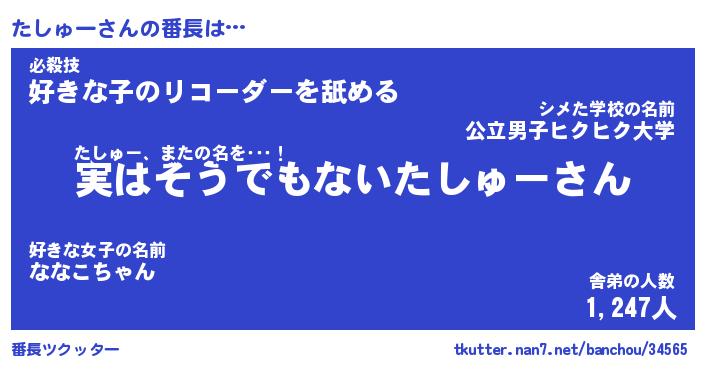 | 肩書あだ名 | 『たしゅー店長』『たしゅー国家主席』 |