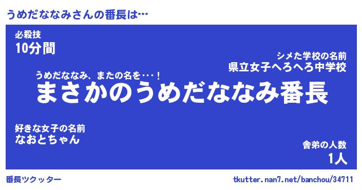| ヒーロー風カッコイイあだ名 | 『スーパーウメダナナミ』『黄金騎士ウメ』 |