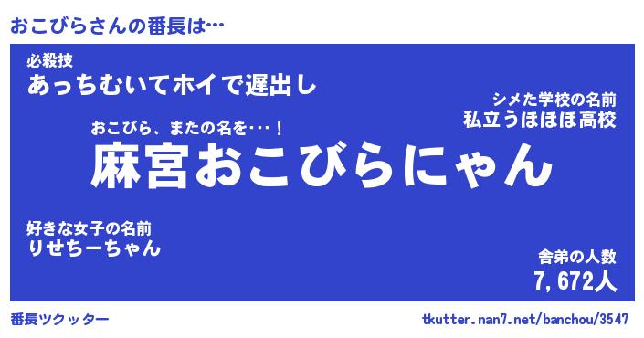 | 意味不明あだ名 | 『ペロリンおこびら』『永久保存おこびら』 |