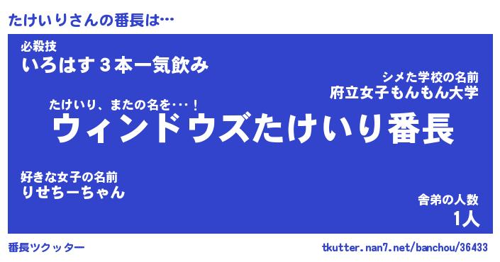 | ヘコむあだ名 | 『たけにー』『なまこ酢』 |