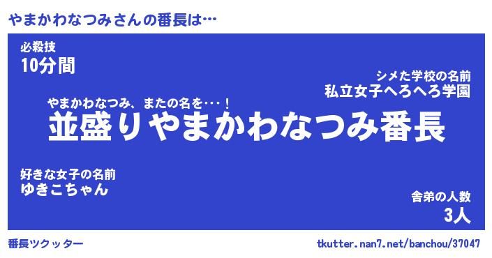 | 男性向けラノベタイトル風あだ名 | 『やまかわなつみの憂鬱』 |