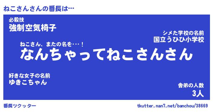 | ヘコむあだ名 | 『ねこもー』『酢こんぶ』『ねこ太郎』 |