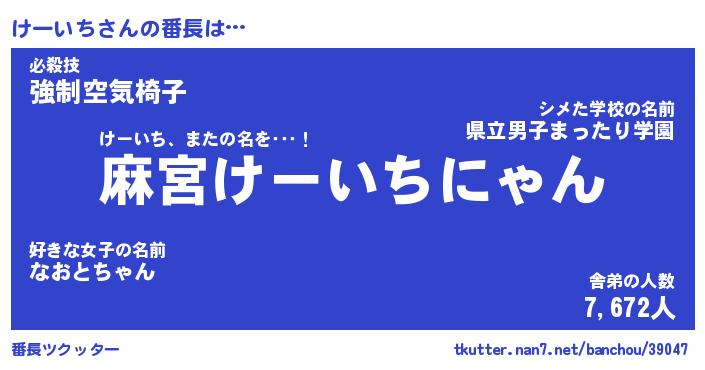 | 意味不明あだ名 | 『ペロリンけーいち』『永久保存けーいち』 |