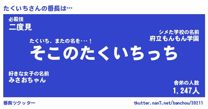 | 意味不明あだ名 | 『ペロリンたくいち』『永久保存たくいち』 |