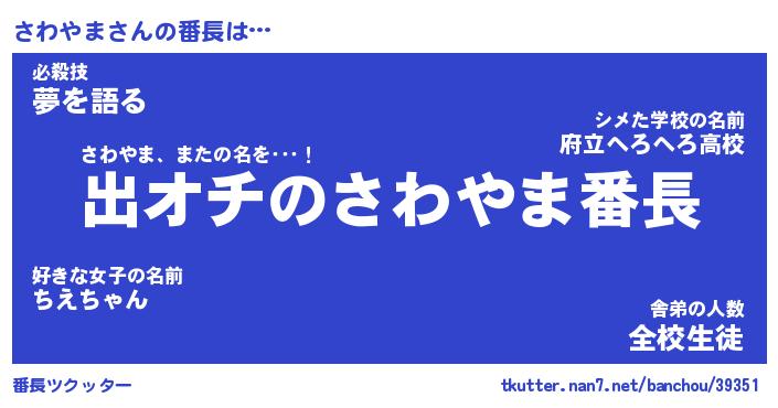 | 伝説のあだ名 | 『伝説のスナイパーさわやま』 |