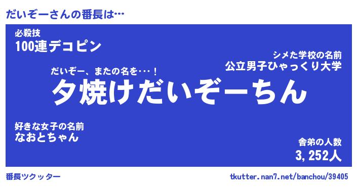 | 意味不明あだ名 | 『ペロリンだいぞー』『永久保存だいぞー』 |