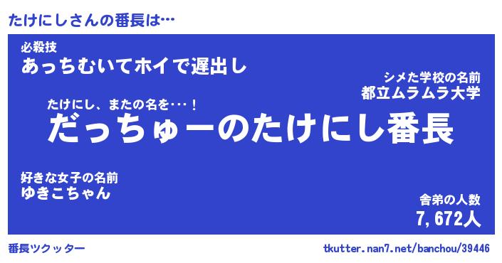 | ヘコむあだ名 | 『たけもー』『なまこ酢』『たけっぺ』 |