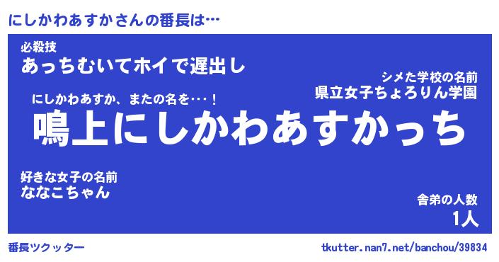 | 男性向けラノベタイトル風あだ名 | 『ニシカワアスカアートオンライン』 |