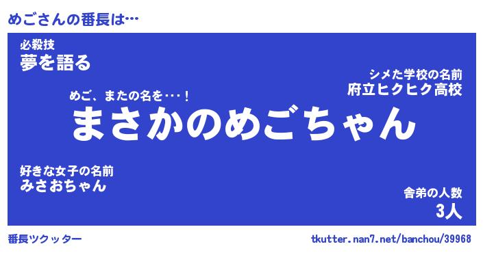 ヘコむあだ名 | 『めごもー』『なまこ酢』『めごっ子』 |