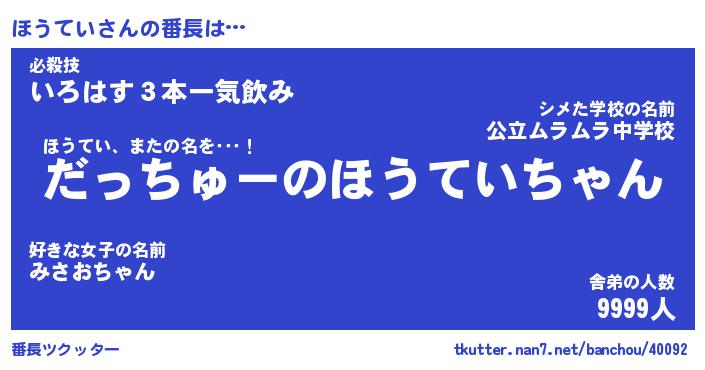 | ヒーロー風カッコイイあだ名 | 『スーパーホウテイ』『黄金騎士ホウ』 |