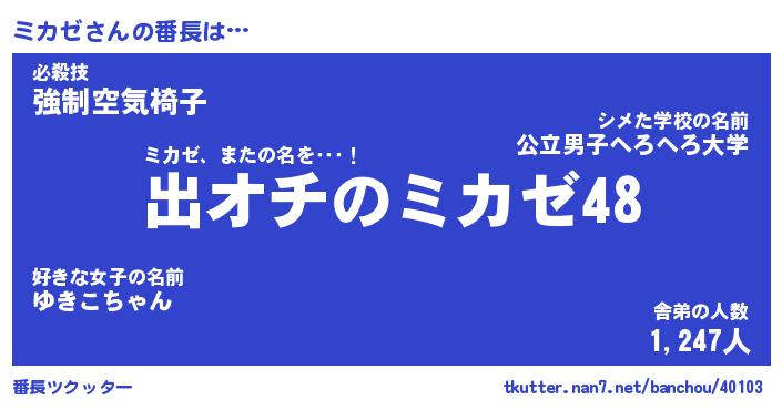 | 意味不明あだ名 | 『ペロリンミカゼ』『ミカゼフォーエバー』 |
