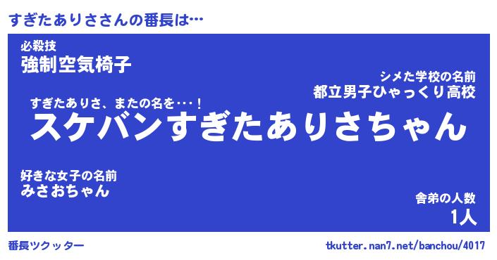 | 伝説のあだ名 | 『不死鳥のスナイパーすぎたありさ』 |