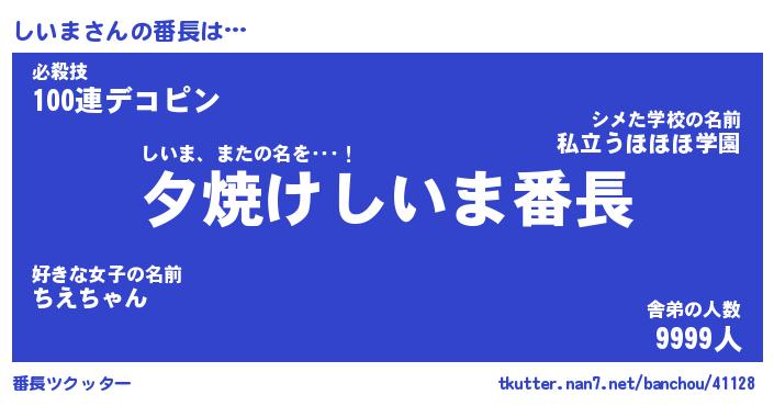 | ヒーロー風カッコイイあだ名 | 『スーパーシイマ』『ウルトラしいまマン』 |