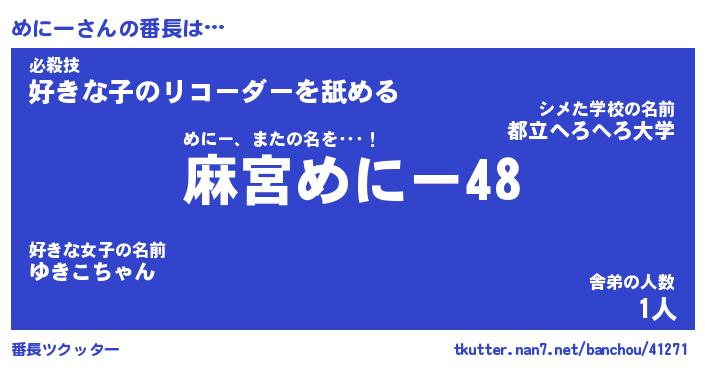 | ヘコむあだ名 | 『めににー』『つくし』『めにぷりん』 |