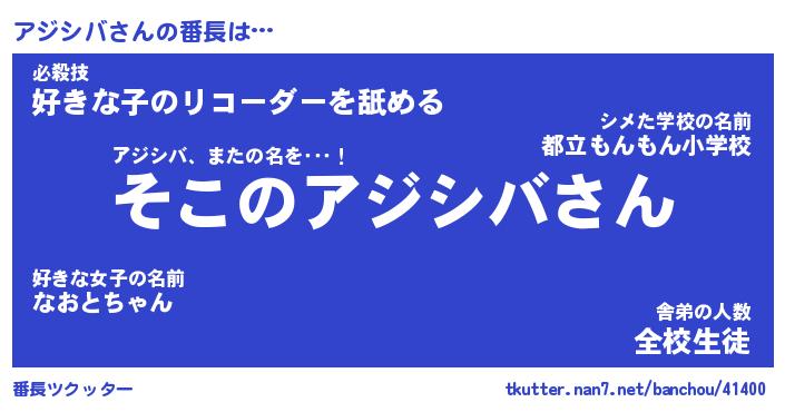 | 意味不明あだ名 | 『ペロリンアジシバ』『永久保存アジシバ』 |